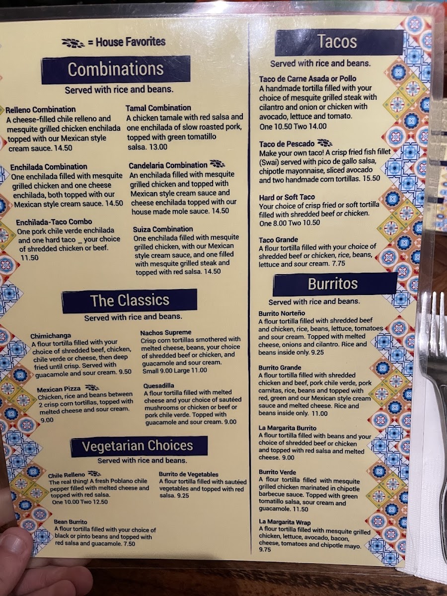 A handmade tortilla filled with your choice of mesquite grilled steak with cilantro and onion or chicken with avocado, lettuce and tomato
